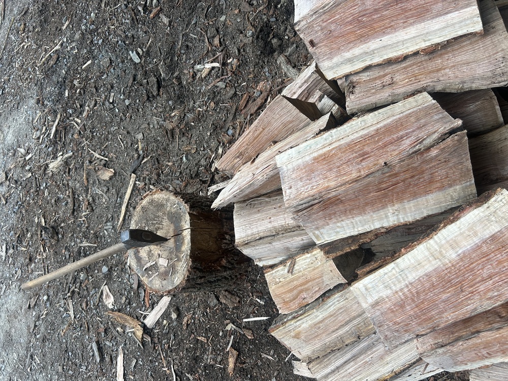 斧でも割るよ 油圧の薪割り機のピストンは力強いですがスピードは遅いので、小さな玉なら斧で割った方が早いです。 ですが、燃費がすこぶる悪い。すぐスタミナ切れになっちゃいます。 斧トレを続けていると腰痛がなくなったりして良いこともありますよ。 割った時の音や感触もいいです。ストレス発散に是非。 バイトしながら体も鍛えたい方募集中です! 薪に晴れ舞台を!