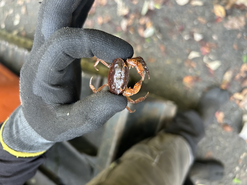 サワガニ発見! 蟹の名前は、◯◯ガニとなるので一人称はガニで。 2、3年前に子供が喜ぶかと思って数匹捕まえて持って帰ったら、玄関で入れ物の蓋が開いて脱走! 家族全員泣き叫びながらサワガニパニックでした。 サワガニはお味噌汁や唐揚げが美味しく食べれますね! 写真のサワガニは沢に帰しました。 薪に晴れ舞台を!