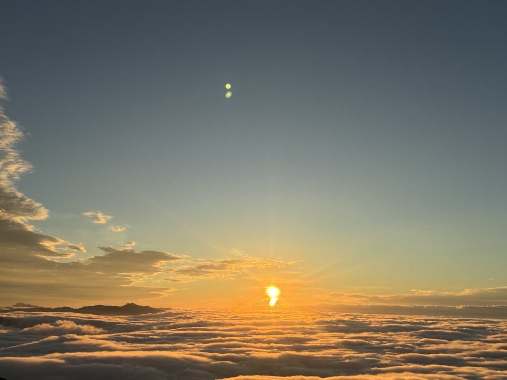 山頂まであと少し9合目 霧も晴れて景色もひらけてめちゃくちゃ綺麗な雲海。 心が何度も折れたおっさんもなんとか登って来ました。 どうやら今日の那岐山のコンディションは最高らしくこんなに綺麗な那岐山は初めてらしい。 あとはご来光を待ちです。