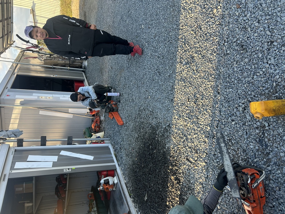 現場が少し早く終わって帰ってからそれぞれ自分の道具のメンテナンス! 日頃からのメンテナンスは重要です。 次の現場に備えての刃を研いだり道具のチェックも忘れずに! 薪に晴れ舞台を!