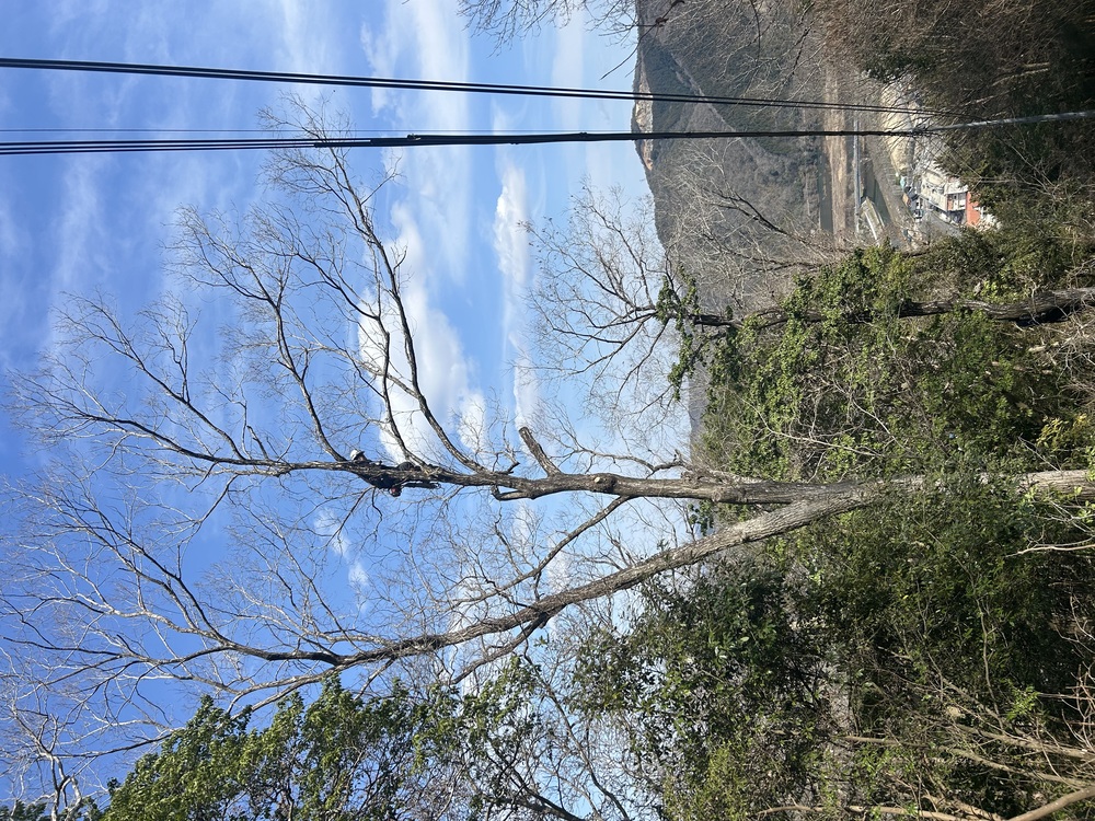 山を縦断している電線の周りを開いては木に登り枝打ち! 開いて枝打ち! 開いて枝打ち! 登って枝打ちが多すぎて社長も参戦! まだまだ先は長い! 社長!お疲れ様です! 薪と社長に晴れ舞台を!
