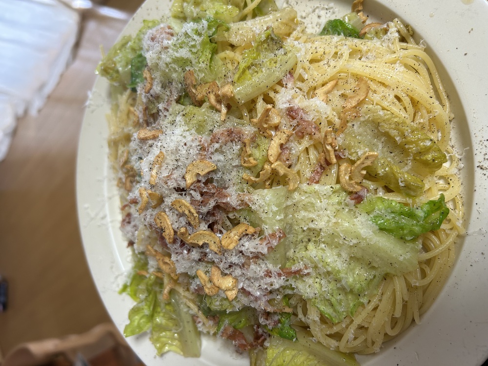 ロメインレタス ベーコン にんにく レモン オリーブオイル パルミジャーノ にんにくはカリカリ 出来上がったらパラパラかけてディープインパクト