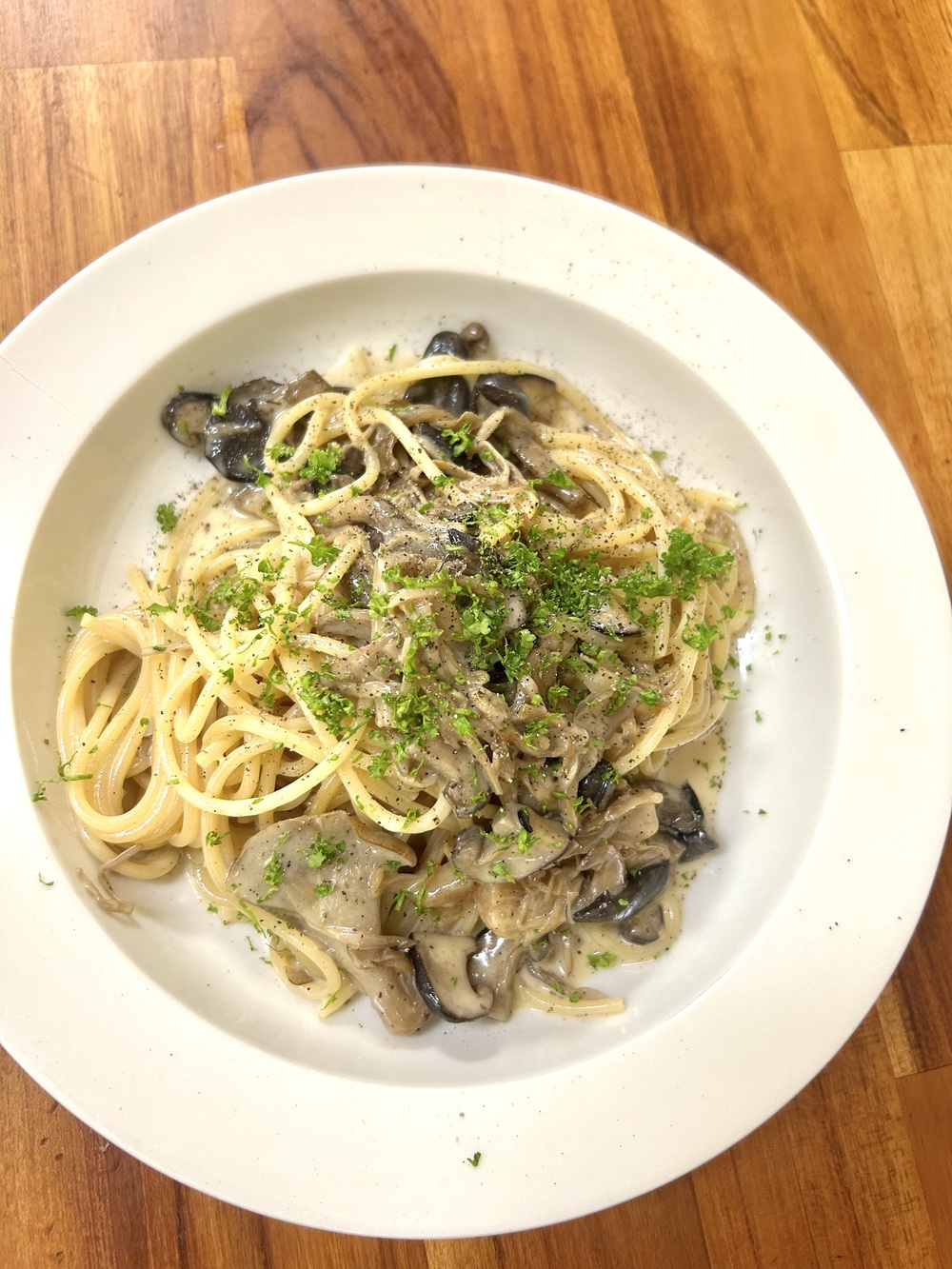 しいたけ・エノキ・舞茸・平茸・マッシュルーム 5種類のキノコのマリネ この間スーパーに鶏ガラが売っていたのでブイヨンを取ってソースのベースに使いました。 ブイヨン、生クリーム、バター、醤油でソースを作り、 キノコのマリネを放り込んだきのこのクリームパスタ 仕上げにパルミジャーノとパセリ、ブラックペッパーでこってりです。 めしあがれ